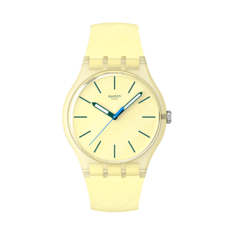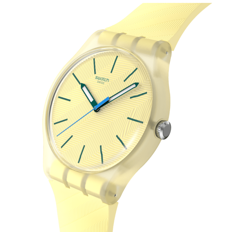 Questo orologio presenta un quadrante giallo chiaro testurizzato con tacche delle ore stampate in verde scuro, lancette delle ore e dei minuti in verde scuro che si illuminano al buio e una lancetta dei secondi blu in una cassa biosourced trasparente opaca di colore giallo chiaro con vetro biosourced. Completa l’orologio un cinturino testurizzato color giallo chiaro opaco con fibbia e passante giallo chiaro trasparente e opaco.