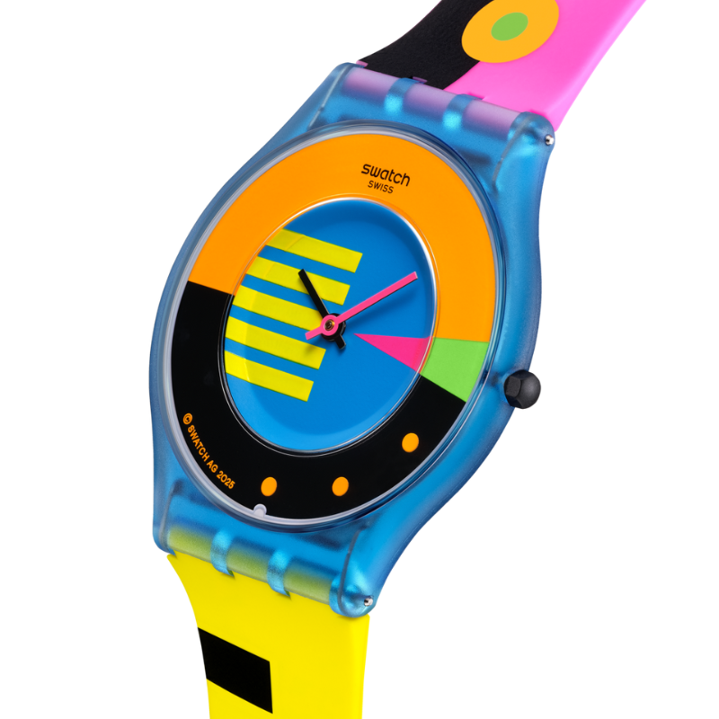 Questo orologio ultrasottile rétro si ispira a uno Swatch GENT anni ’80: il FLUMOTIONS da collezione (GN102). Il quadrante multicolore presenta una lancetta delle ore nera e una lancetta dei minuti rosa in una cassa biosourced color blu opaco trasparente con vetro biosourced. Il cinturino inferiore in giallo opaco e il cinturino superiore in rosa opaco presentano una stampa multicolore e sono completati da un passante trasparente opaco e da una fibbia trasparente in giallo opaco.