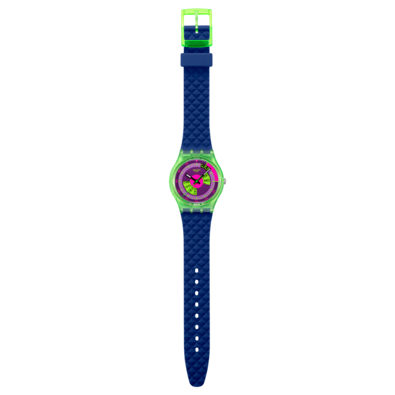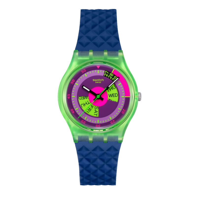 Questo orologio rétro ò si ispira a uno Swatch GENT anni ’90: lo SKYCHART da collezione (GN705). Il suo quadrante multicolore presenta speciali finestre con i giorni a ore 3 e 9 e un datario a ore 1. Sotto il vetro biosourced, l’orario è indicato da lancette delle ore e dei minuti nere che si illuminano al buio e da una lancetta dei secondi verde. La cassa biosourced color verde trasparente opaco è completata da un cinturino blu scuro opaco testurizzato con passante blu scuro opaco e una fibbia in verde opaco trasparente.