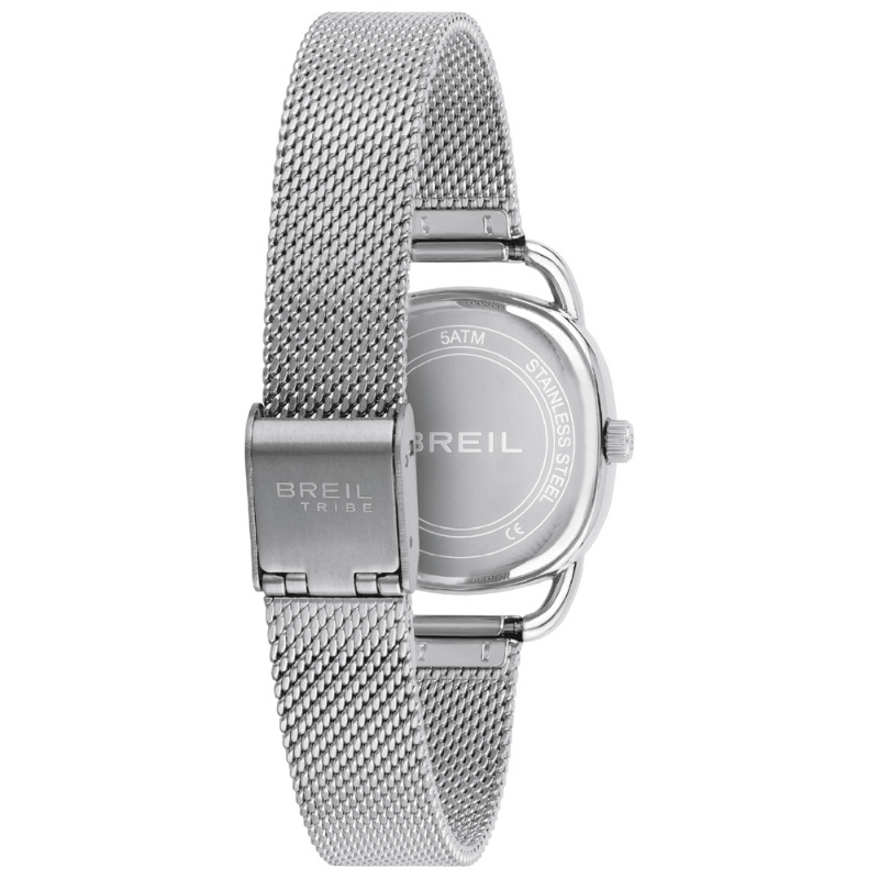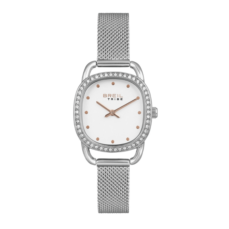 L’orologio solo tempo da donna Penelope è caratterizzato da uno stile tipicamente retrò, sottolineato dalla forma quadrata della cassa, decorata da lucenti cristalli e dalle anse sottili. Il bracciale in maglia milanese è in acciaio, come la cassa che racchiude il quadrante bianco con dettagli in IP rose.